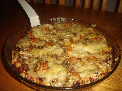 En antanut kohota vaan laitoin taikinan öljyttyyn vuokaan.Ruskistin n.200g jauhelihaa ja sipulin.